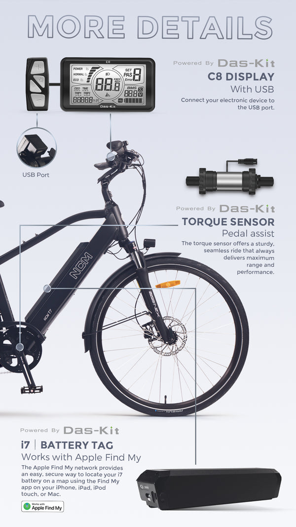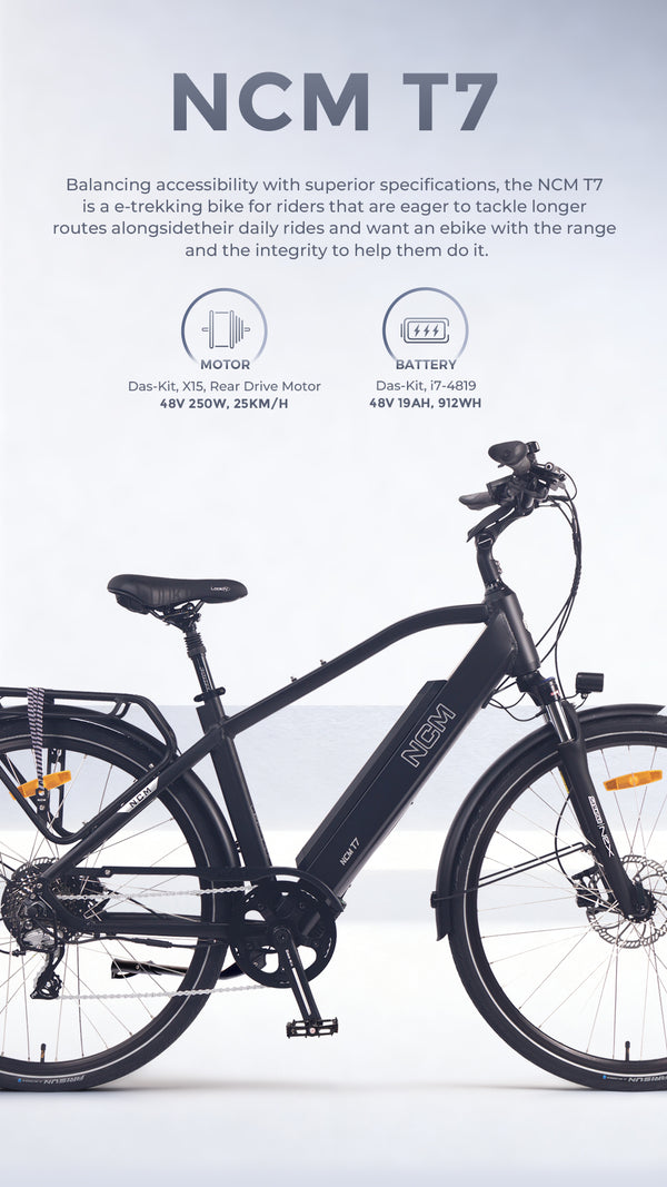 Balancing accessibility with superior specifications, the NCM T7 is a e-trekking bike for riders who are eager to tackle longer routes alongside their daily rides and want an e-bike with the range and the integrity to help them do it.